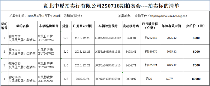東風(fēng)日產(chǎn)牌轎車3輛、東風(fēng)標(biāo)致牌轎車一輛-拍賣公告