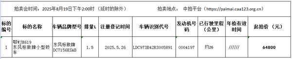 以上車(chē)輛自發(fā)布公告之日起在標(biāo)的所在地公開(kāi)展示。競(jìng)買(mǎi)人現(xiàn)場(chǎng)查驗(yàn)車(chē)輛需提前電話聯(lián)系,看樣時(shí)間公告之日起至2025年8月18日17:00止(工作時(shí)間),聯(lián)系人:高經(jīng)理 18071110981。